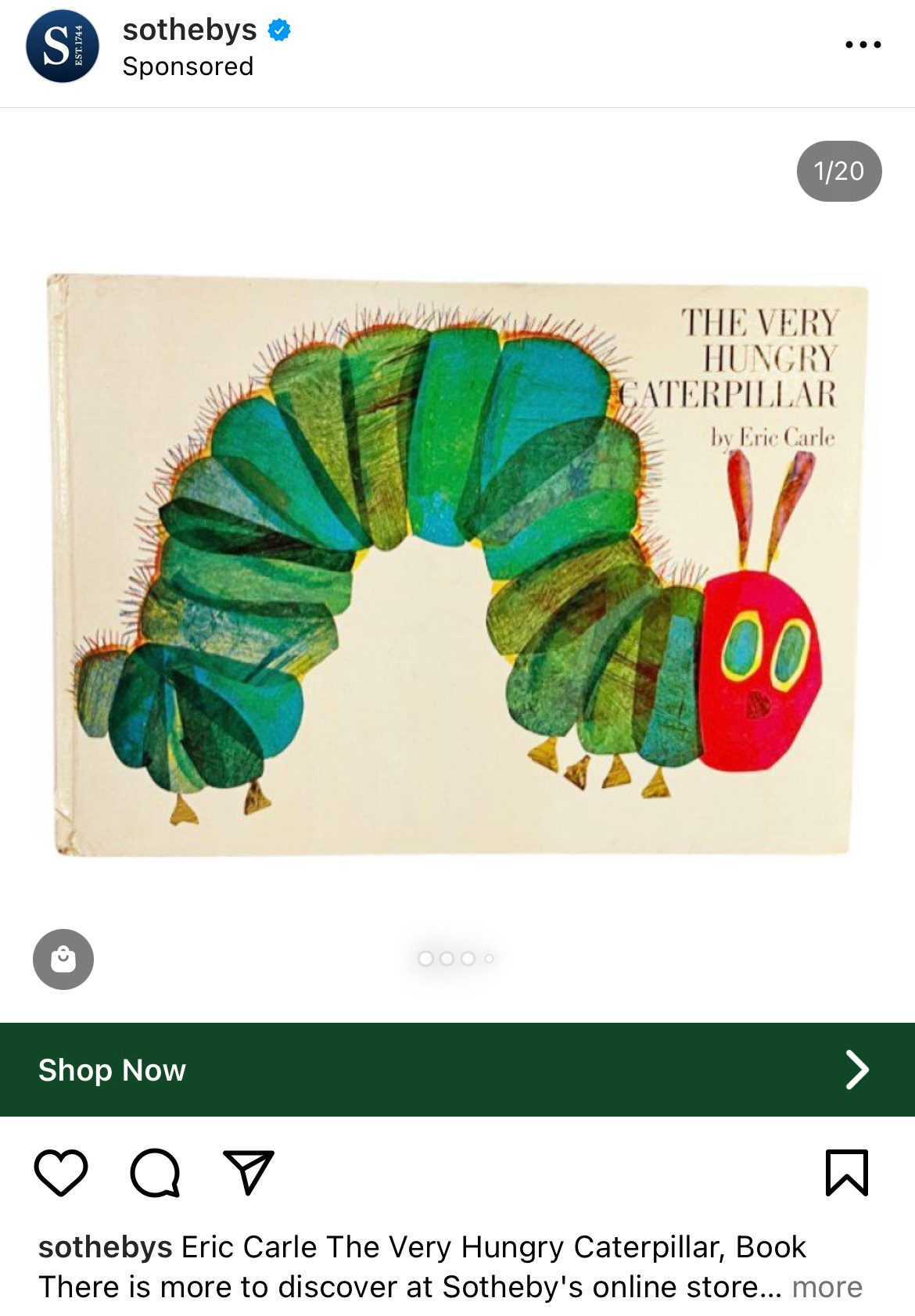 While doing so, it has become quite clear that social media has (unsurprisingly) taken note of the changes in my personal life, with the algorithms working overtime to serve me exclusively baby and new mom content. (See below… even Sotheby’s knows I might be interested in The Very Hungry Caterpillar by Eric Carle.)